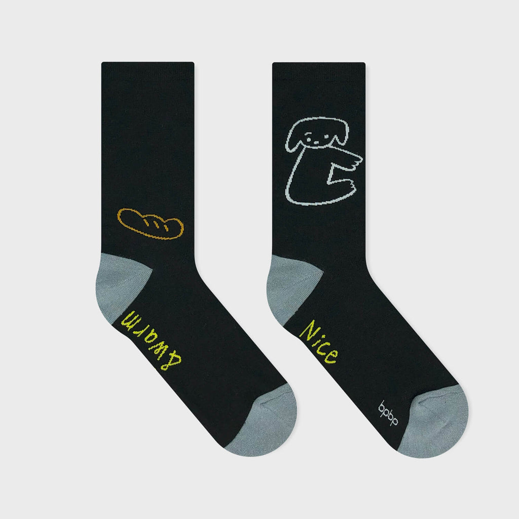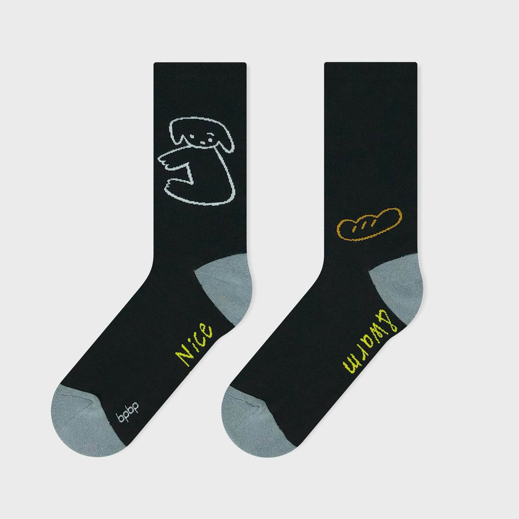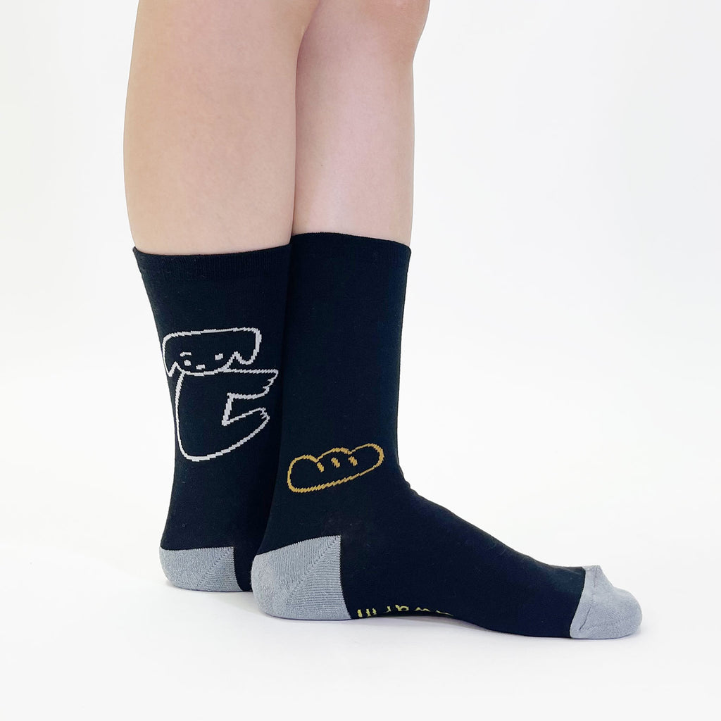 片眉のイヌとフランスパンが側面に配されたデザインです。ソールには柄ごとに異なるメッセージが入っています。
